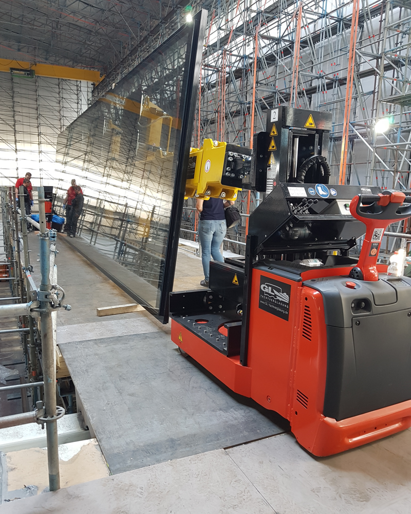 Der Glasboy 5300 ist eine Sonderanfertigung zur Verglasung von extrem schweren Glasscheiben. Auf unserem Foto oben handelte es sich um 1 Glasscheibe mit einer Länge von über 11000 cm und einer Höhe von ca. 3000 cm.